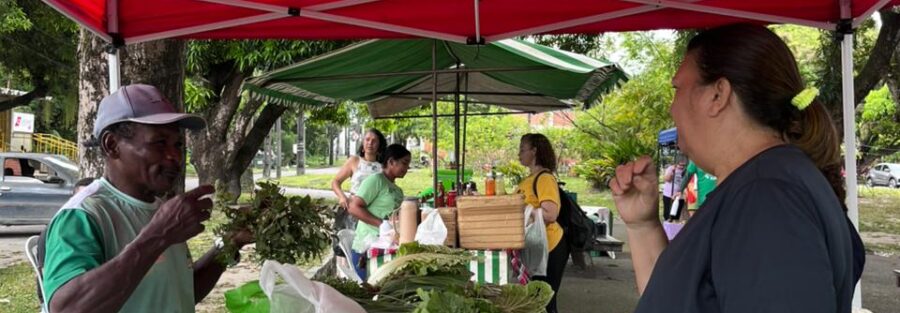 Durante a Feira Agroecológica e da Economia Solidária da UFRPE, realizamos uma roda de conversa e oficina de preparo de sucos naturais, com direito a degustação, por meio do Projeto Nos Trinques II.