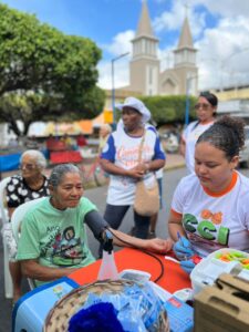 Além da vivência culinária, a ação disponibilizou serviços de saúde, como aferição de pressão e glicemia, e realizou inscrições para o próximo intercâmbio do projeto, ampliando o acesso a cuidados e oportunidades de formação para quem frequenta a feira.