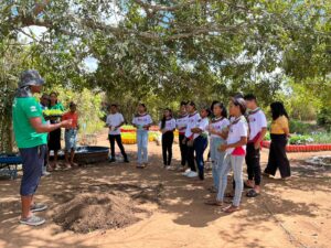 Em seguida, o grupo visitou a horta da escola, onde a coordenadora Marcilene Lima conduziu uma conversa sobre o cuidado com as plantas, a importância da produção sustentável e o papel das hortas escolares na promoção da educação ambiental.
