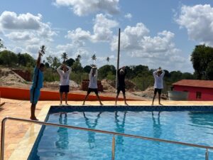 Os jovens do Projeto Ecoturismo – Guia para o Futuro participaram de mais uma aula de natação, dando continuidade a um processo de aprendizado que vai muito além da prática esportiva.