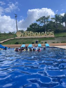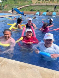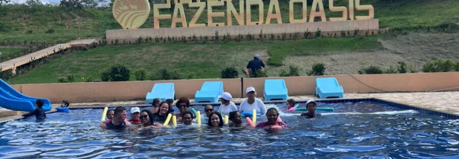 Após o almoço, a programação seguiu com momentos de relaxamento, incluindo banho de piscina e descanso no redário, em um clima de alegria e integração.