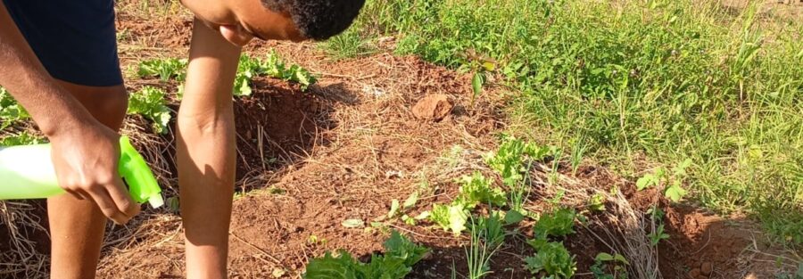 Os jovens participantes do Projeto Raízes aprendem em sala de aula e, com o acompanhamento do técnico de campo Tiago Jatobá, colocam em prática os conhecimentos adquiridos na produção de biofertilizantes. Eles estão aplicando o produtos nos quintais produtivos cultivados nas propriedades das suas famílias.