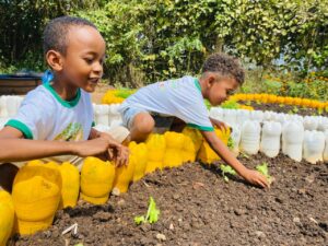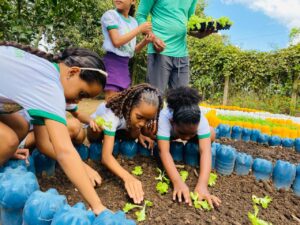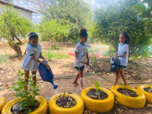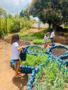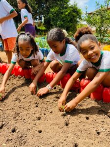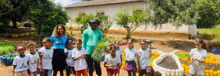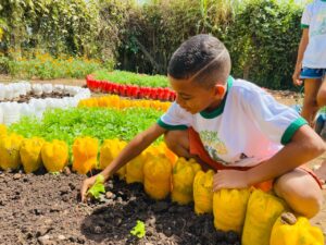 As crianças do Projeto Educasan estão colocando em prática todo o aprendizado na horta da Escola Municipal Antônio Mendonça. Com muito cuidado, amor e dedicação, eles plantam, cuidam e colhem suas próprias hortaliças.